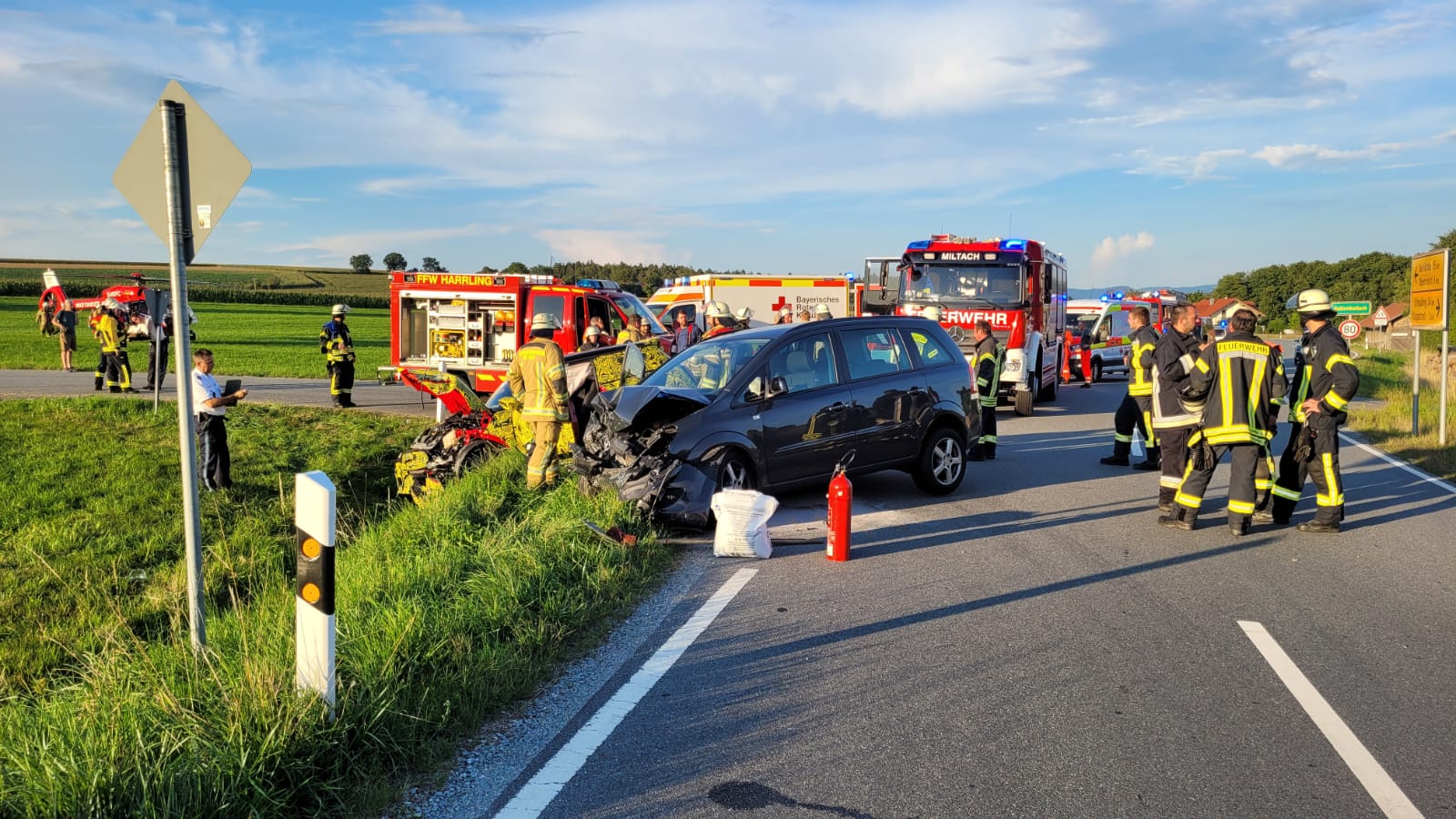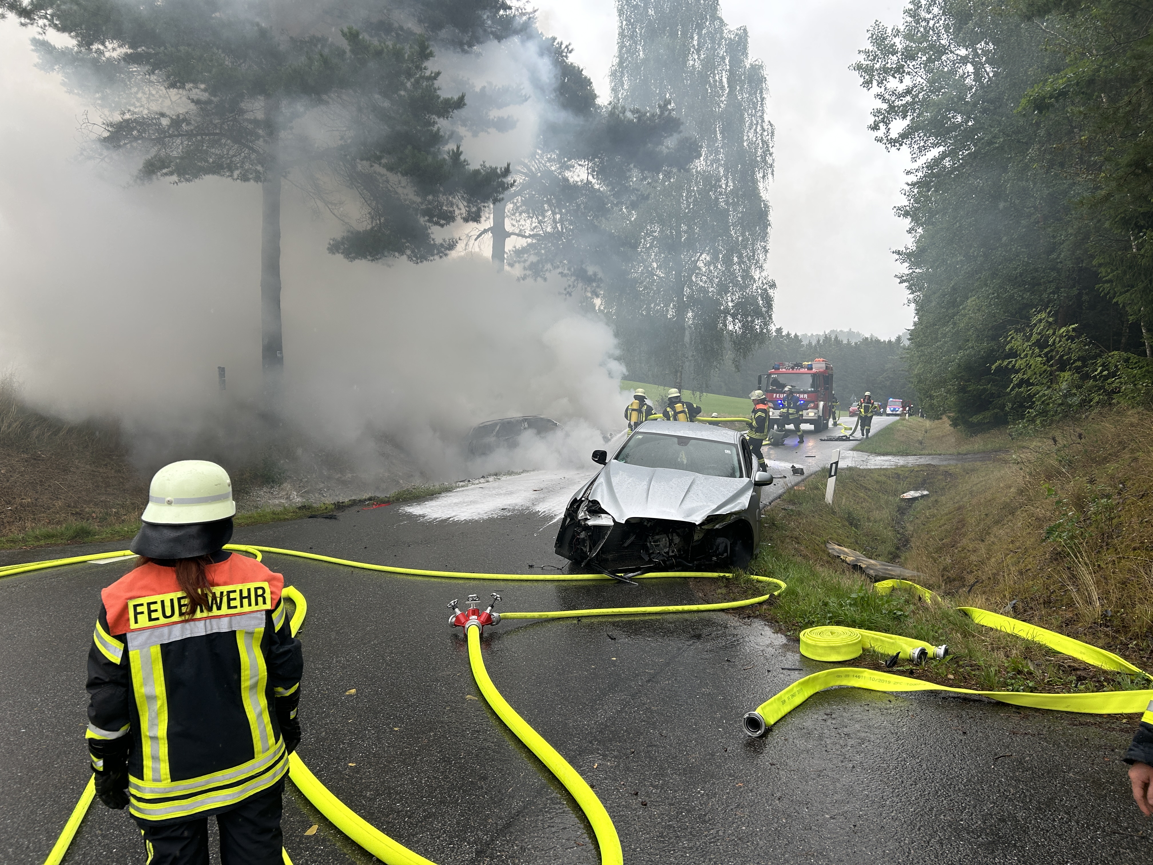 Am Mittwoch dem 02.08.2023 wurde die FF Zandt zusammen mit der FF Harrling zu einem VU in Nasting Fahrtrichtung Weihermühle alamiert. Zwei PKW stießen zusammen wobei ein PKW Feuer fing.