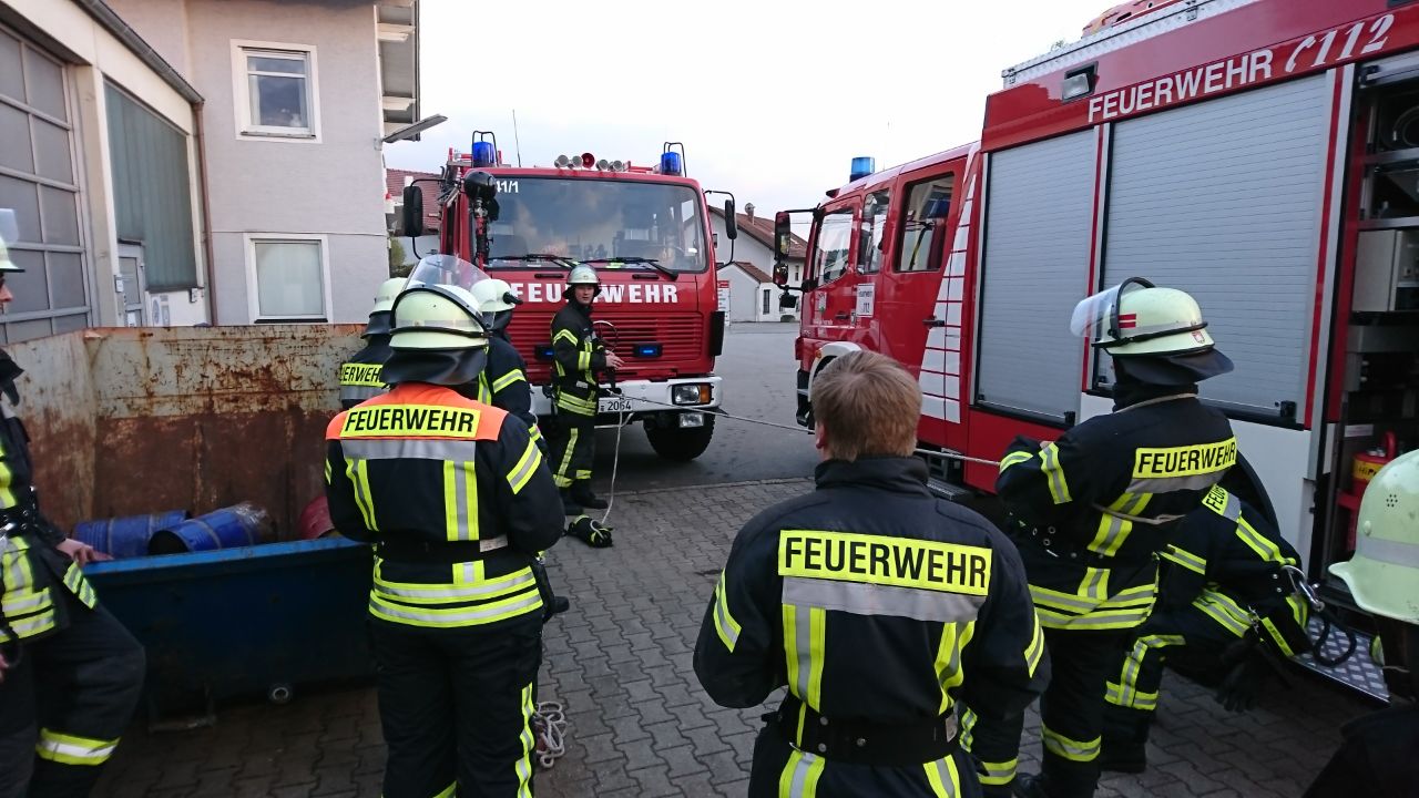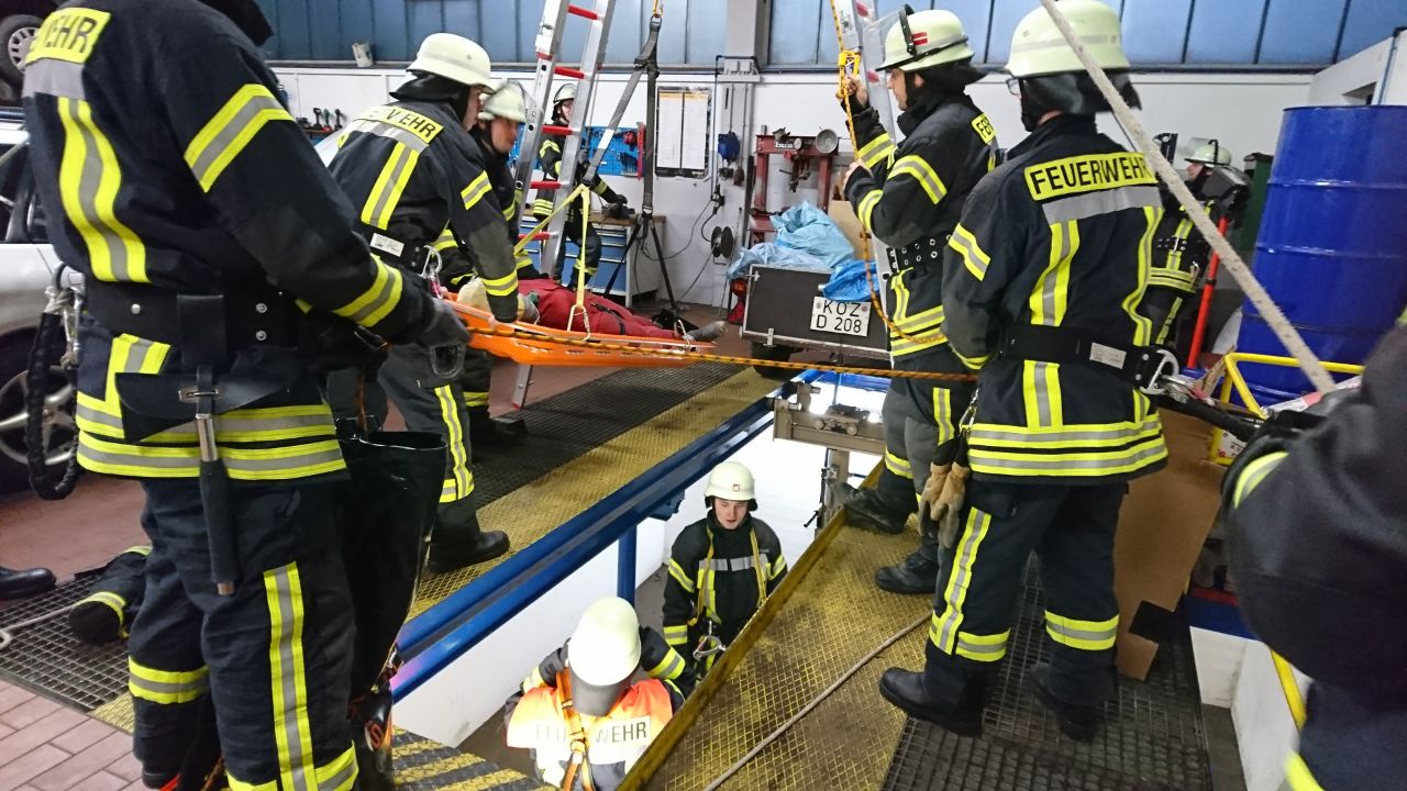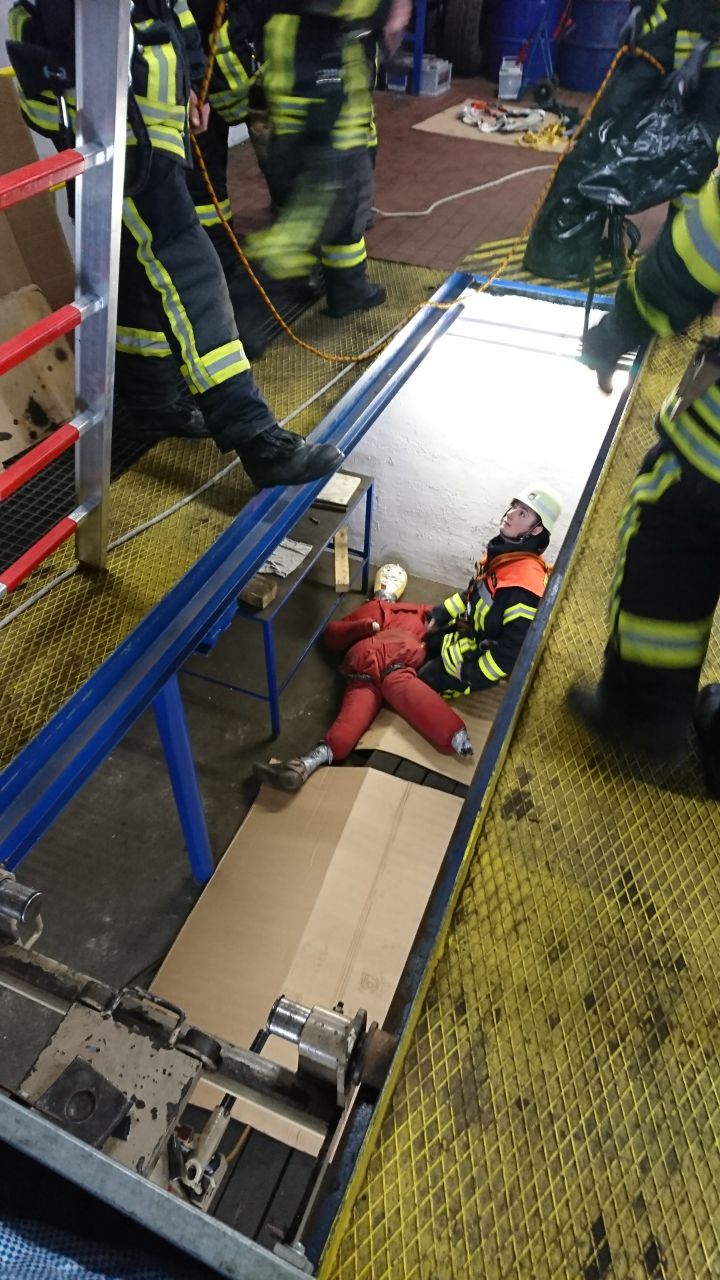 Hierfür fuhr man zur Firma KFZ Baumgartner, welche über eine dementsprechende Arbeitsgrube verfügt. Laut Übungsszenario war eine Person bewusstlos zusammengebrochen, und musste nun schnellstmöglich gerettet werden. Zunächst bauten die Kameraden eine Bockleiter mit Flaschenzug über der Grube auf, anschließend wurden zwei Feuerwehrmänner mittels Gerätesatz Absturzsicherung zum Verletzten abgelassen. Nach dessen Stabilisierung wurde dieser durch die übrigen Aktiven mit Hilfe der Scheifkorbtrage gerettet.