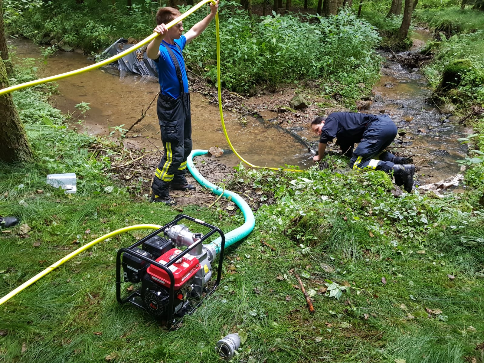 Ein ortsansässiger Teichwirt wendet sich an 1. Kommandant Michael Baumgartner, da seine insgesamt drei Fischteiche nicht mehr ausreichend mit Frischwasser versorgt werden. Aufgrund mangelnden Zuflusses an Wasser, droht ein Sauerstoffmangel mit daraus resultierendem Fischsterben. Vor Ort stellt der Kommandant fest, dass der Zulauf vermutlich durch Schlamm und Geäst verstopft ist und daher die Fischteiche nicht mehr ausreichend versorgt werden.